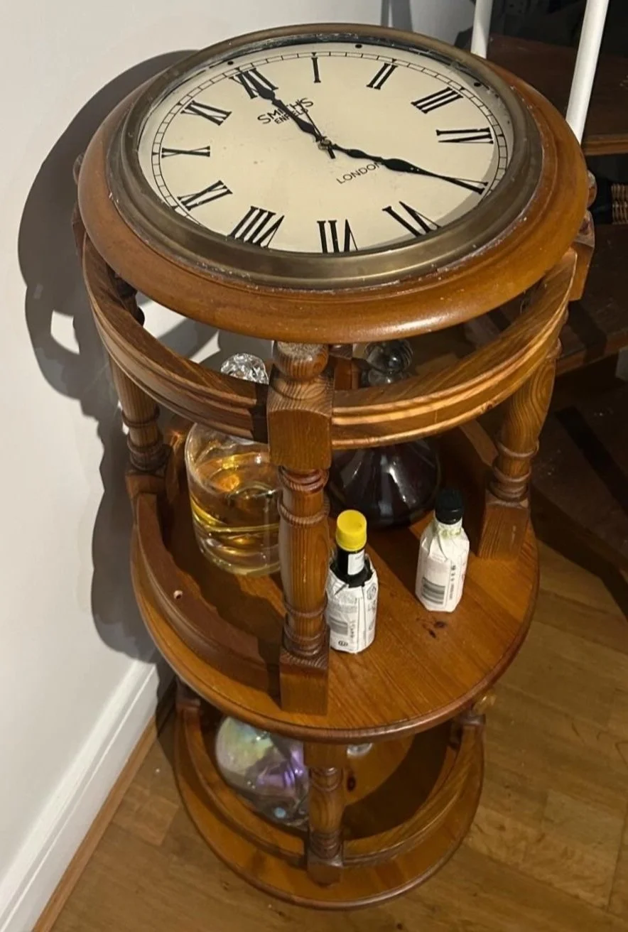 This piece was made from discarded bedside tables and a broken clock face. Restored and permanently set to just a few moments past five, this bar cart exists to raise and store spirits